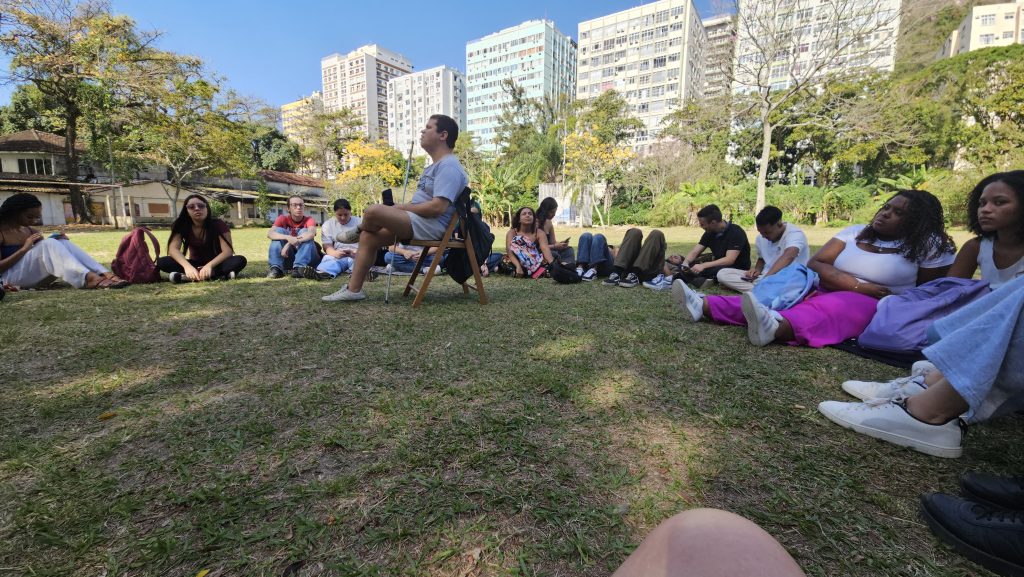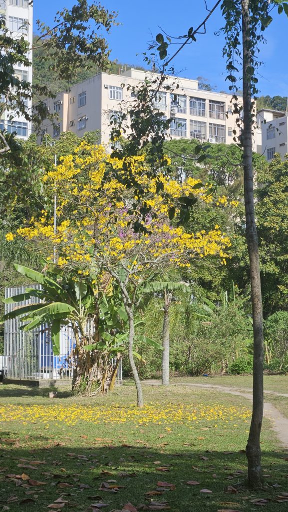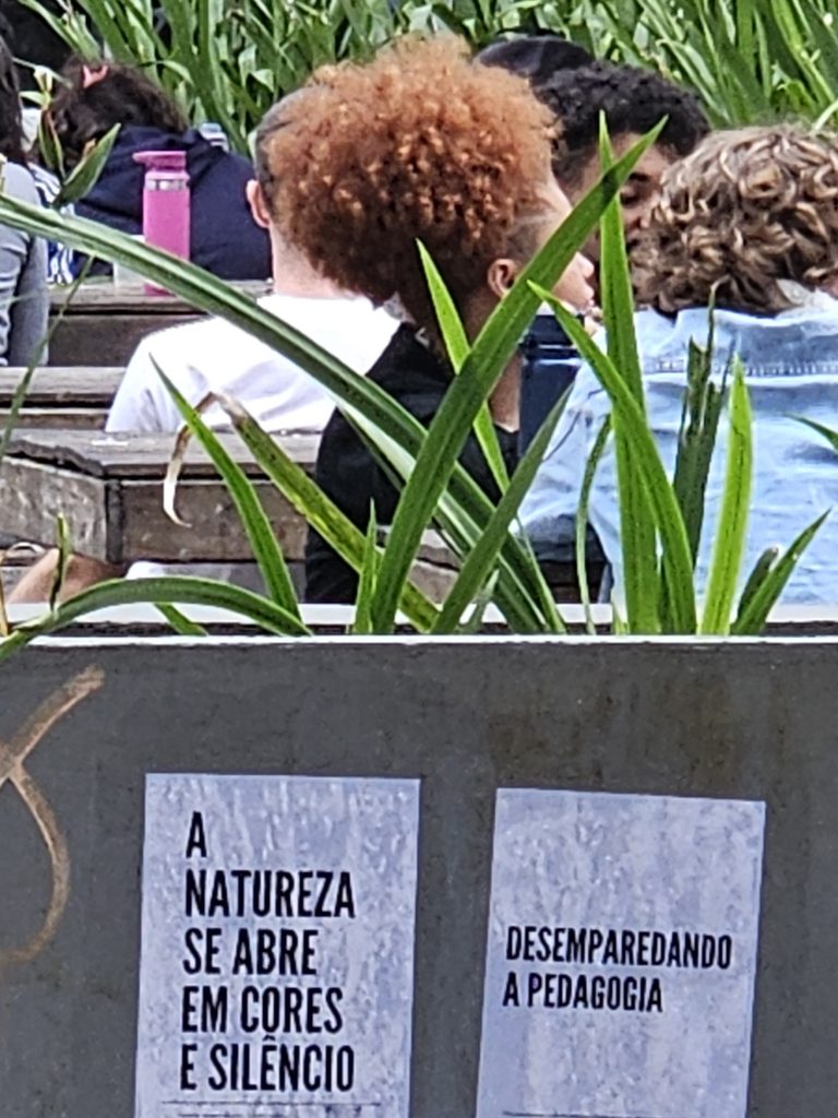 Na sexta-feira 5/9, as turmas de Didática das Ciências da Natureza (manhã e tarde) fizeram uma incursão pelo campus fotografando suas flores, árvores e canteiros, e observando detalhes como inscrições nas paredes, pequenos arbustos, o canto dos pássaros e outras delicadezas que, na rotina das aulas, passam despercebidas. Observaram, também, a enorme quantidade de lixo abandonado em seus canteiros e no chão (quinta à noite o DCE faz uma festa e sempre encontramos muito lixo às sextas). Em seguida, fomos ao campinho visitar a agrofloresta mantida pelo coletivo Jussara e, novamente, observar o espaço, com seus maravilhosos ipês amarelos e os tapumes que nos separam do pedaço de área verde que nos foi subtraído. Fizemos um intervalo, sentadas à sombra para conversar sobre a importância de atividades como essa, que nos conectam ao espaço compartilhado, à natureza, e umas às outras. O texto que inspirou a atividade trata do conceito de “desemparedamento da infância” e concluímos que também nós precisamos nos desemparedar, buscar outros espaços de aprendizagem e de produção de conhecimentos. Pedimos que, em grupo, as turmas fizessem colagens de fotos que tiraram do “passeio” e produzissem frases que de alguma forma expressassem o vivido. Essas colagens foram postadas no Instagram da disciplina @did.cienciasnatureza.
