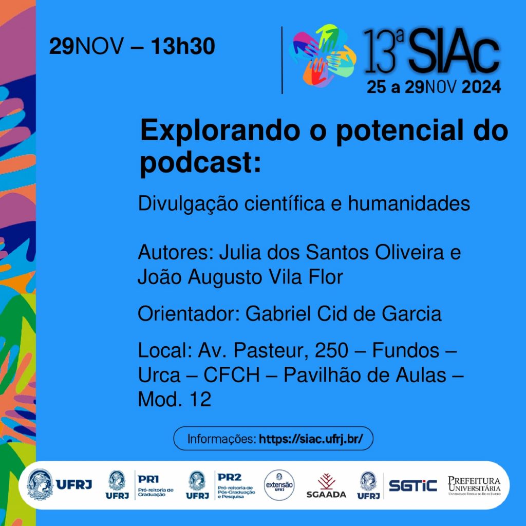 Nesta sexta, dia 29/11, acontece a apresentação do trabalho ‘Explorando o potencial do podcast: divulgação científica e humanidades’, de autoria da bolsista PIBIC Julia dos Santos Oliveira e do bolsista PROFAEX João Augusto Vila Flor.