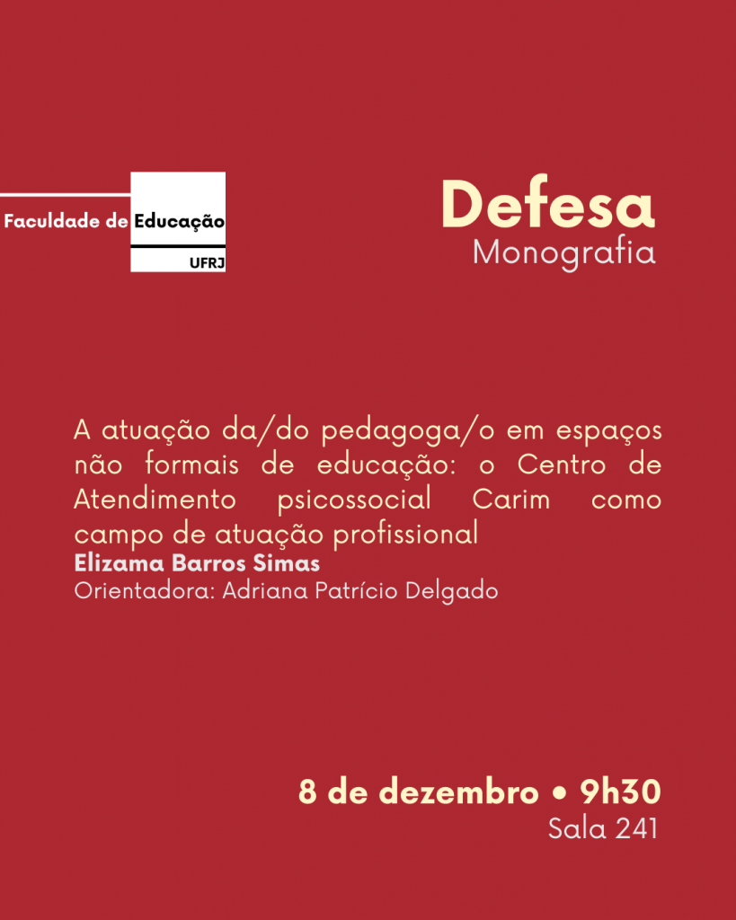 Defesa de monografia: A atuação da/do pedagoga/o em espaços não formais de educação: o Centro de Atendimento psicossocial Carim como campo de atuação profissional